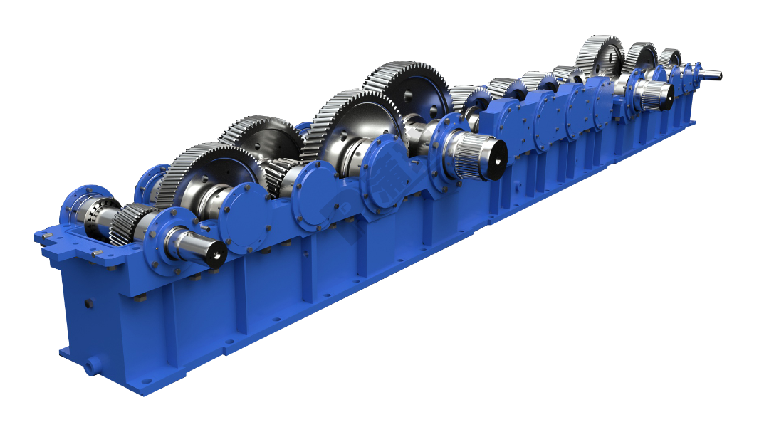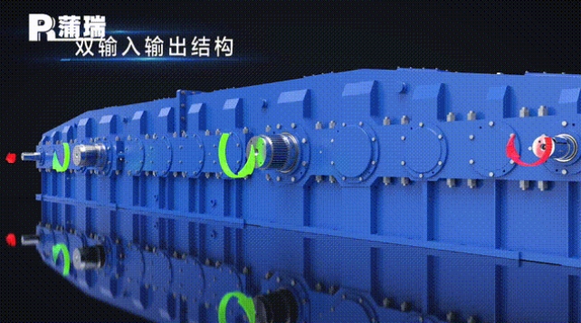 01 大型冶金起重機用一字型減速機采用雙輸入雙輸出的對稱布置結(jié)構(gòu),多級傳動,嚴(yán)格同步運行,具有防反轉(zhuǎn)功能。